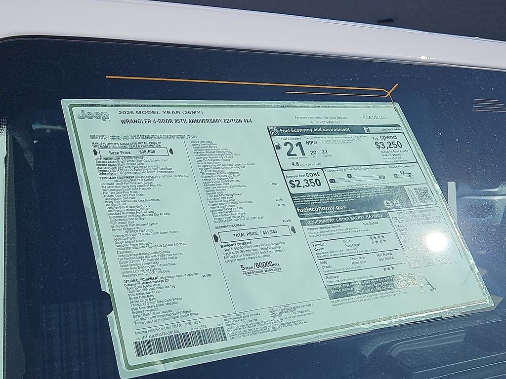 Quick Order Package 22F 85th Anniversary Edition: 17" X 7.5" Steel Oxide Wheels; Heated Front Seats; Anti-Lock 4-Wheel Disc Brakes; Mayan Gold Interior Accents; 85th Tailgate Decal; 85th Wrangler Hood Decal; Body Color Fenders Flares; Daytime Running Lamps LED Accents; Front LED Fog Lamps; LED Premium Reflector Headlamps; Heated Steering Wheel; Plaid Wrap Instrument Panel Mid-Bolster; Cloth Seat W/Plaid Insert & Tag; Corning Gorilla Glass; Security Alarm; Air Filtering; Alpine Premium Audio System; Advanced Brake Assist; Berber Floor Mats; Automatic Headlamps; 85th Shifter Medallion; Air Conditioning W/Auto Temp Control; Bronze Tow Hooks; Deep Tint Sunscreen Windows; Berber Cargo Mats; Central ADAS Decision Module (CADM); 85th Fender Decal; Full Speed Forward Collision Warning Plus; Emergency/Assistance Call; Gray/Bronze Trail Rated Badge; 2-Door Passive Entry. Front Door Locks; Cluster 7.0" TFT Color Display; Power Heated Mirrors; Universal Garage Door Opener; Adaptive Cruise Control W/Stop; 85th Anniversary Group; 85th Cupholder Plaque; Premium Wrapped Steering Wheel; Sun Visors W/Illuminated Vanity Mirrors. Trailer Tow & Aux Switch Group: Class II Receiver Hitch; 7 & 4 Pin Wiring Harness; Auxiliary Switches. Quick Order Package 24F 85th Anniversary Edition: 17" X 7.5" Steel Oxide Wheels; Heated Front Seats; Anti-Lock 4-Wheel Disc Brakes; Mayan Gold Interior Accents; 85th Tailgate Decal; 85th Wrangler Hood Decal; Body Color Fenders Flares; Daytime Running Lamps LED Accents; Front LED Fog Lamps; LED Premium Reflector Headlamps; Heated Steering Wheel; Plaid Wrap Instrument Panel Mid-Bolster; Cloth Seat W/Plaid Insert & Tag; Corning Gorilla Glass; Security Alarm; Air Filtering; Alpine Premium Audio System; Advanced Brake Assist; Berber Floor Mats; Automatic Headlamps; 85th Shifter Medallion; Air Conditioning W/Auto Temp Control; Bronze Tow Hooks; Deep Tint Sunscreen Windows; Berber Cargo Mats; Central ADAS Decision Module (CADM); 85th Fender Decal; Full Speed Forward Collision Warning Plus; Emergency/Assistance Call; Gray/Bronze Trail Rated Badge; 2-Door Passive Entry. Front Door Locks; Cluster 7.0" TFT Color Display; Power Heated Mirrors; Universal Garage Door Opener; Adaptive Cruise Control W/Stop; 85th Anniversary Group; 85th Cupholder Plaque; Premium Wrapped Steering Wheel; Sun Visors W/Illuminated Vanity Mirrors. Body Color 3-Piece Hard Top. **Equipment listed is based on original vehicle build and subject to change. Please confirm the accuracy of the included equipment by calling the dealer prior to purchase.**