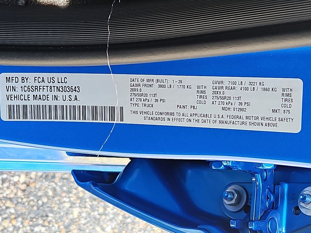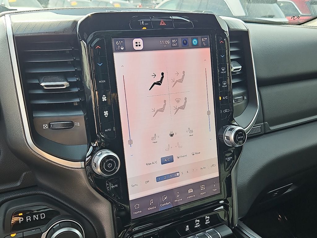 Quick Order Package 27Z Big Horn. Big Horn Level 2 Equipment Group: Google Android Auto; SiriusXM Radio Service; USB Host Flip; Power Adjustable Pedals; Leather Wrapped Steering Wheel; Integrated Voice Command with Bluetooth®; 12" Touchscreen Display; Glove Box Lamp; Auto Power-Folding Mirrors; 115V Auxiliary Rear Power Outlet; Media Hub with 2 Charge Only USBs; Heated Front Seats; Security Alarm; Black Premium Power Mirrors; Apple CarPlay; Premium Overhead Console; 9 Amplified Speakers with Subwoofer; Disassociated Touchscreen Display; Body Color Fender Flares; Remote Tailgate Release; 115V Auxiliary Power Outlet; LED Dome Lamp with On/off Switch; Universal Garage Door Opener; 2nd Row in Floor Storage Bins; Sun Visors with Illuminated Vanity Mirrors; LED Footwell Lighting; Rear Window Defroster; Integrated Center Stack Radio; Rear View Auto Dim Mirror; Rear Power Sliding Window; Connectivity - US/Canada; GPS Navigation; 4G LTE Wi-Fi Hot Spot; GPS Antenna Input; Overhead LED Lamps; Exterior Mirrors with Heating Element; Auto Dim Exterior Driver Mirror; SiriusXM with 360L; Global Telematics Box Module; Connected Travel and Traffic Services; Heated Steering Wheel; Configurable Drive Mode; 400W Inverter; HD Radio; Deluxe Cloth Bucket Seats; Uconnect 5 Navigation with 12.0" Display Radio; Exterior Mirrors with Supplemental Signals; Steering Wheel Mounted Audio Controls; Exterior Mirrors Courtesy Lamps; Air Conditioning ATC with Dual Zone Control; Cluster 7.0" TFT Color Display; Convex Wide-Angle Exterior Mirror Insert. Night Edition: 275/55R20 OWL All Season Tires; Accent Color Premium Power Mirrors; Exterior Mirrors with Supplemental Signals; Black Headlamp Bezels; Exterior Mirrors Courtesy Lamps; Grille Black Surround Black Mesh; Auto Power-Folding Mirrors; Exterior Mirrors with Heating Element; 20" X 9.0" Aluminum Painted Clad Wheels; Auto Dim Exterior Driver Mirror; Black Exterior Truck Badging; Anti-Spin Differential Rear Axle; Accent Color Door Handles; Accent Color Tailgate Handle; Black Interior Accents; Dual Exhaust with Black Tips; Body Color Front Bumper; Convex Wide-Angle Exterior Mirror Insert; Body Color Rear Bumper with Step Pads; Black Tail Lamp Bezels; RAM Grille Badge - Black; Black Painted Exterior Mirrors Caps. Bed Utility Group: MOPAR Spray in Bedliner; MOPAR Deployable Bed Step; MOPAR 4 Adjustable Cargo Tie-Down Hooks; Pick-Up Box Lighting; Exterior 115V AC Outlet. Quick Order Package 23Z Big Horn. Dual-Pane Panoramic Sunroof. 9 Amplified Speakers with Subwoofer. Anti-Spin Differential Rear Axle. Trailer Brake Control. Hydro Blue Pearlcoat. Cluster 12" TFT Color Display. 3.92 Rear Axle Ratio. Rear Wheelhouse Liners. **Equipment listed is based on original vehicle build and subject to change. Please confirm the accuracy of the included equipment by calling the dealer prior to purchase.**