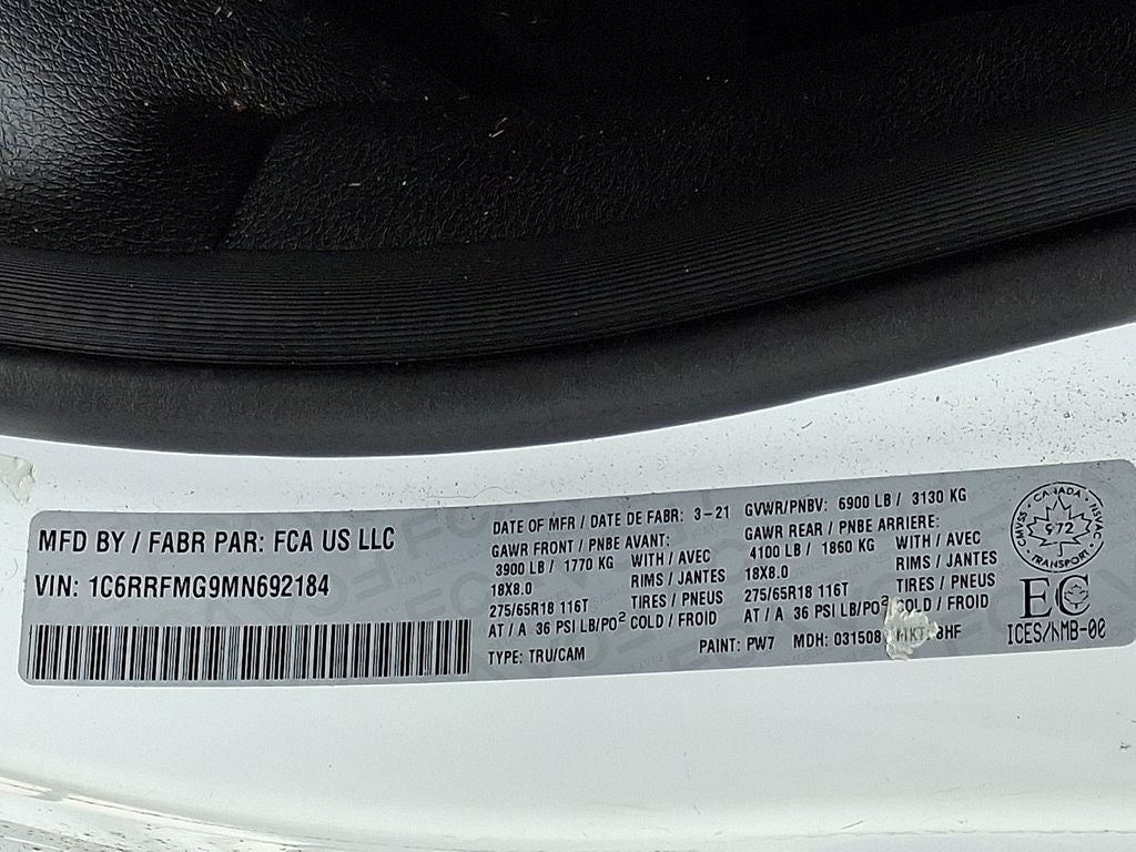 Apple CarPlay: Seamless smartphone integration for this model - stay connected and entertained on the go! This Ram 1500 is equipped with the latest generation of XM/Sirius Radio. Our dealership has already run the CARFAX report and it is clean. A clean CARFAX is a great asset for resale value in the future. This Ram 1500 offers Android Auto for seamless smartphone integration. This 2021 Ram 1500 has satellite radio capabilities. Bluetooth® technology is built into it, keeping your hands on the steering wheel and your focus on the road. Protect this 1/2 ton pickup from unwanted accidents with a cutting edge backup camera system. This model shines with clean polished lines coated with an elegant white finish. This 2021 Ram 1500 has a V6, 3.6L high output engine. This 2021 Ram 1500 has four wheel drive capabilities. This model has adjustable pedals that are luxurious and safety conscious. With the keyless entry system on this 1/2 ton pickup you can pop the trunk without dropping your bags from the store.