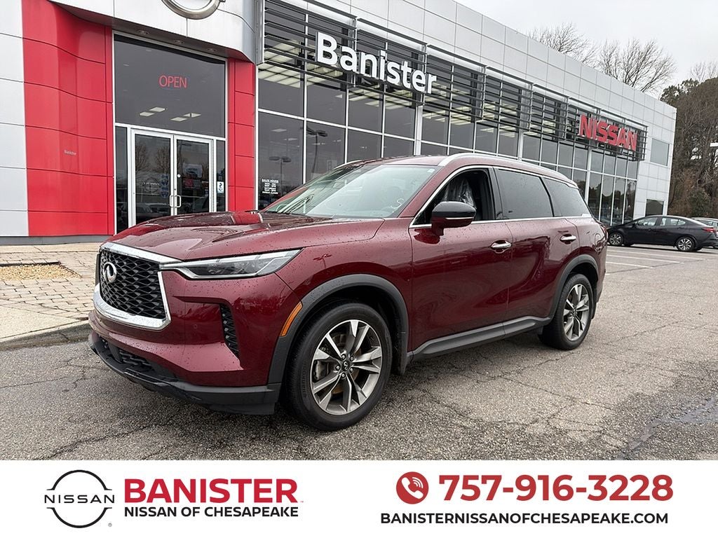 Exceptional 2023 INFINITI QX60 LUXE AWD — premium performance, modern technology, and unbeatable value in Chesapeake, VA. This one-owner luxury SUV pairs a smooth and responsive V6 3.5L gasoline engine with confident all-wheel drive, delivering refined power and sure-footed handling for every driving condition. With a carefully maintained interior featuring supple leather seats and a heated steering wheel, comfort is prioritized for driver and passengers on every route. Loaded with advanced connectivity and safety: Android Auto keeps your smartphone apps, navigation, and music seamlessly integrated while the BOSE stereo provides immersive audio for road-trip quality sound. Forward Collision Warning adds a critical layer of protection, helping you stay aware of potential hazards. Practical luxury features and thoughtful ergonomics make daily commutes and long-distance travel equally enjoyable. This INFINITI QX60 LUXE combines style and substance: elegant exterior lines, a spacious third-row seating layout, and premium materials throughout. The vehicle offers excellent fuel efficiency for its class and strong resale value backed by INFINITI engineering. Located in Chesapeake, VA, this model is priced to sell — the best price available for comparable year, trim, and condition in the area. Act quickly to secure a top-tier luxury SUV with pedigree, performance, and packed features at unmatched value. Contact us to schedule a test drive and experience the exceptional driving dynamics of this 2023 INFINITI QX60 LUXE today.