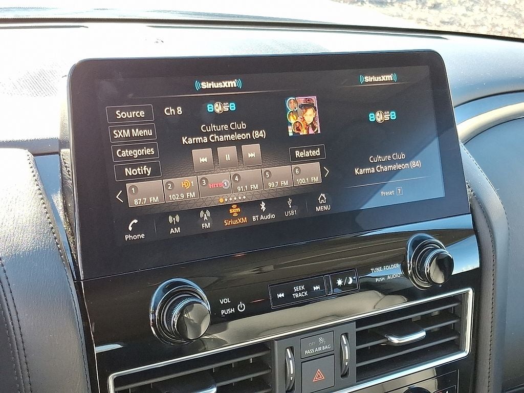 The vehicle offers Automatic Climate Control for personalized comfort. You'll never again be lost in a crowded city or a country region with the navigation system on this Nissan Armada. This unit offers Apple CarPlay for seamless connectivity. This 1/2 ton suv comes equipped with Android Auto for seamless smartphone integration on the road. The state of the art park assist system will guide you easily into any spot. Bluetooth® technology is built into the vehicle, keeping your hands on the steering wheel and your focus on the road. Never get into a cold vehicle again with the remote start feature on this 1/2 ton suv. This vehicle is a certified CARFAX 1-owner. This Nissan Armada has a clean CARFAX vehicle history report. The leather seats in this vehicle are a must for buyers looking for comfort, durability, and style. with XM/Sirus Satellite Radio you are no longer restricted by poor quality local radio stations while driving it. Anywhere on the planet, you will have hundreds of digital stations to choose from.